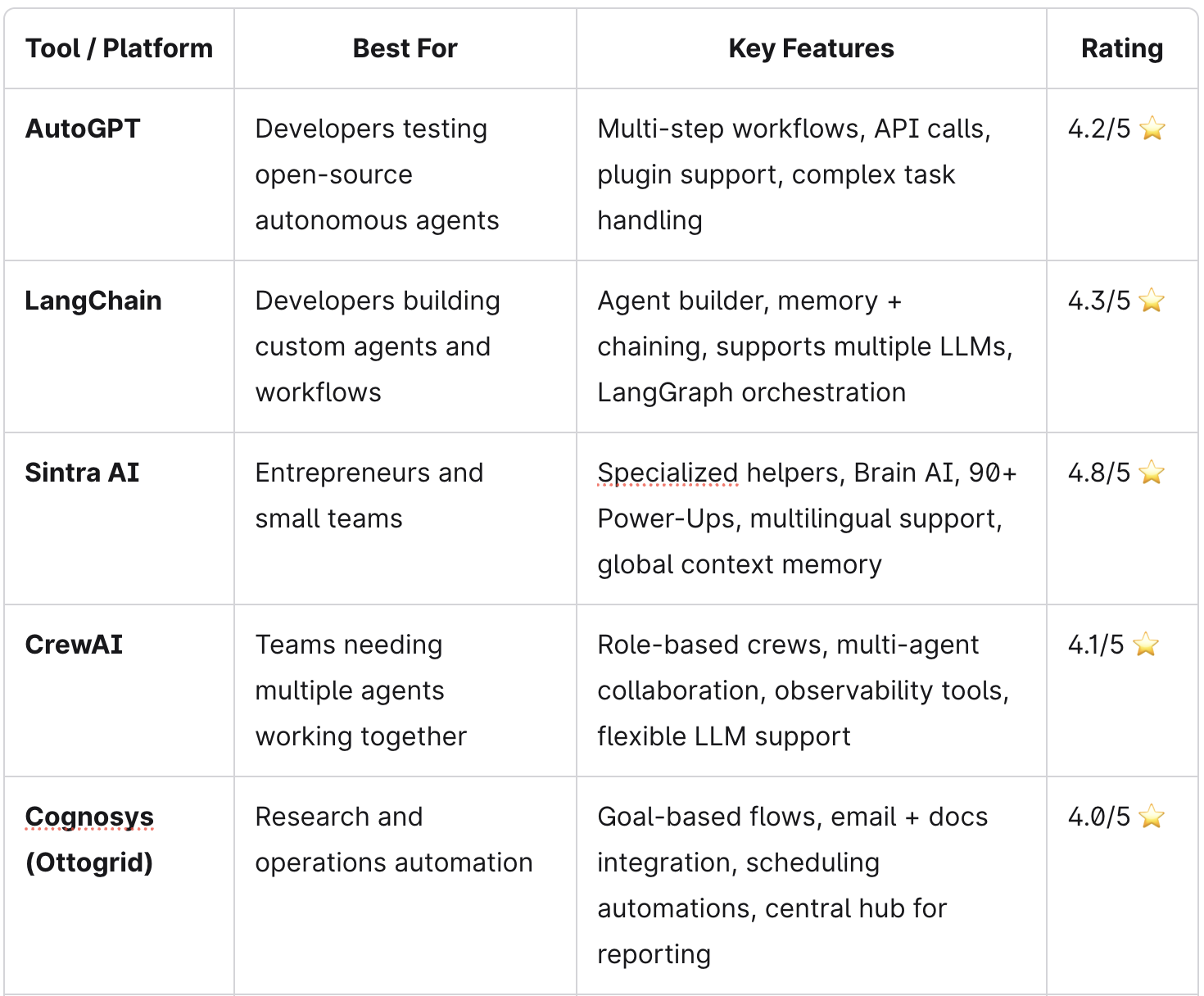The most popular options among developers are AutoGPT and LangChain, and they are powerful frameworks if you have the technical skills. But after testing different tools myself, I believe Sintra AI is the best overall choice.