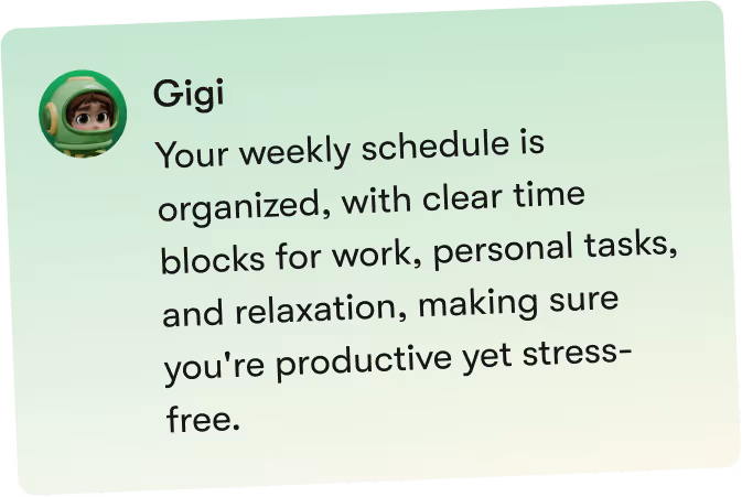 From daily tasks to long-term planning, Gigi helps you stay organized, focused, and in control. Our personal AI assistant is built to reduce mental load, not add more apps to manage.
