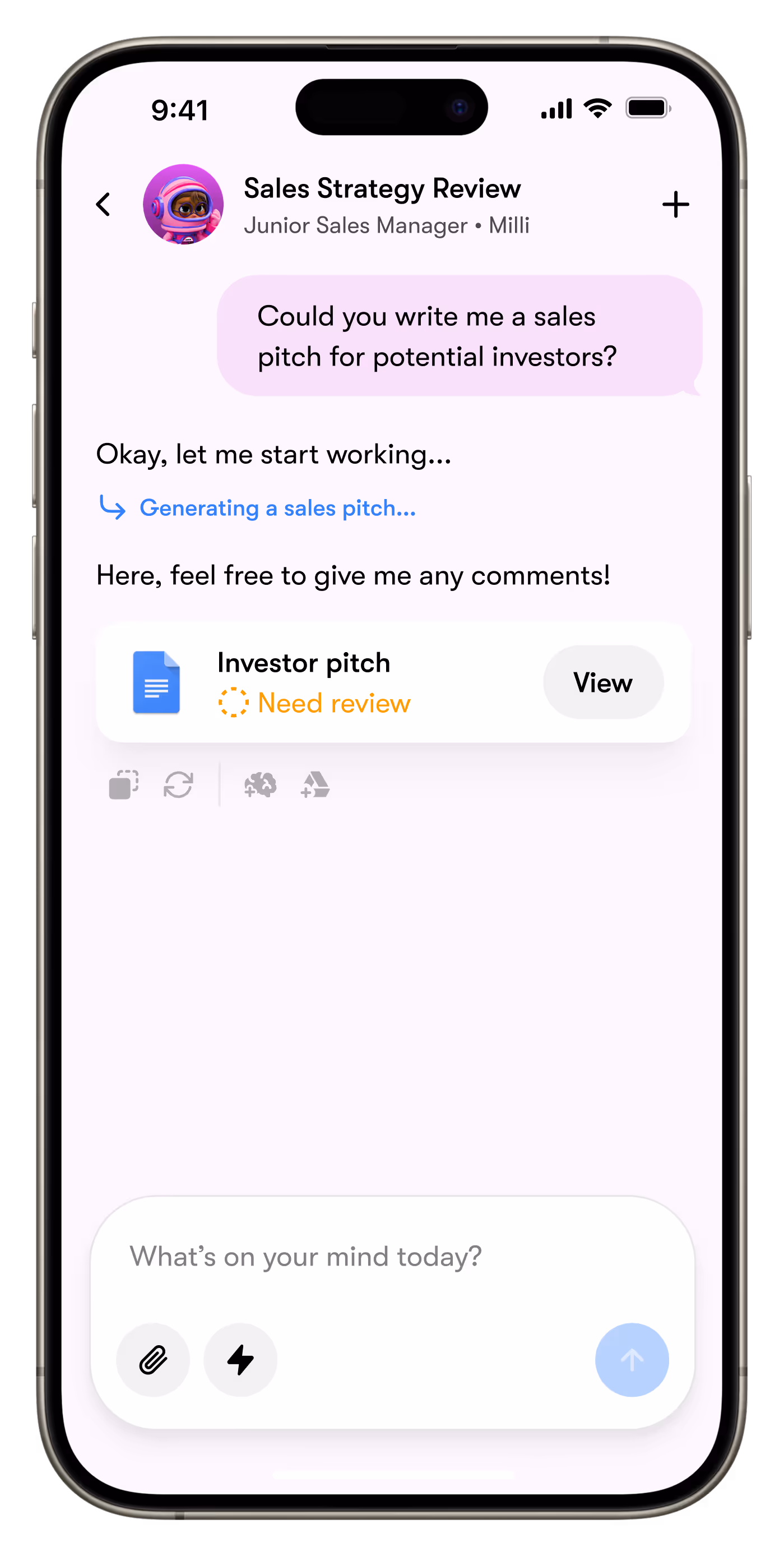 Ask, review, approve. Milli keeps interactions short and focused so momentum isn’t lost between steps.